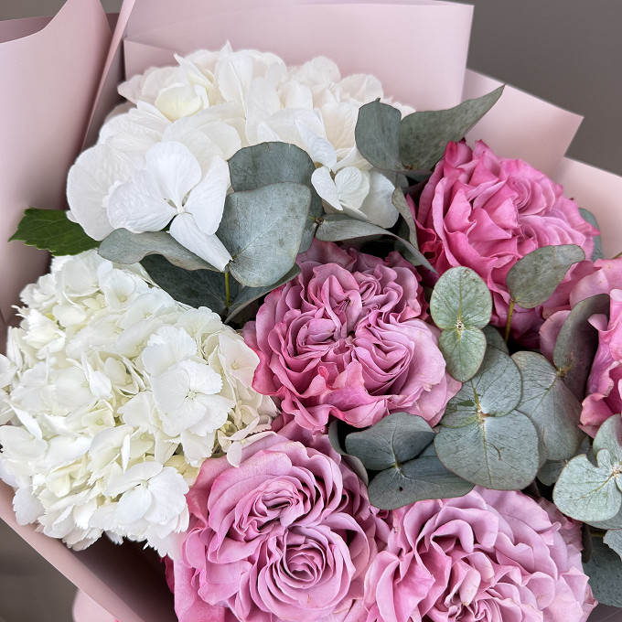 Гортензия, Лента, Пленка, Роза пионовидная, Эвкалипт